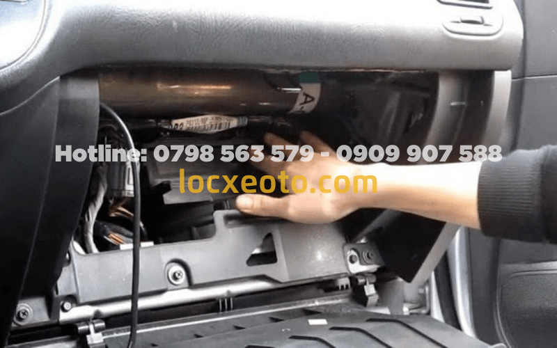 - Sau đó tháo hộp đựng đồ ở phía dưới táp lô và tháo nắp nhựa dưới chân kính chắn gió để lấy phần lọc gió điều hòa ra.